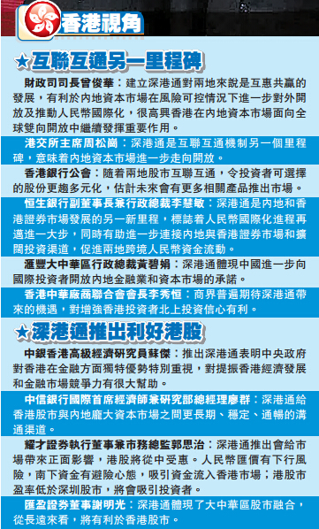 昨日,李克强宣布消息时指,启动深港通有利於投资者更好共用内地与香港经济发展成果,深化内地与香港金融合作,巩固和提升香港作为国际金融中心的地位,也有利於进一步发挥深港区位优势,推动内地与香港更紧密合作。