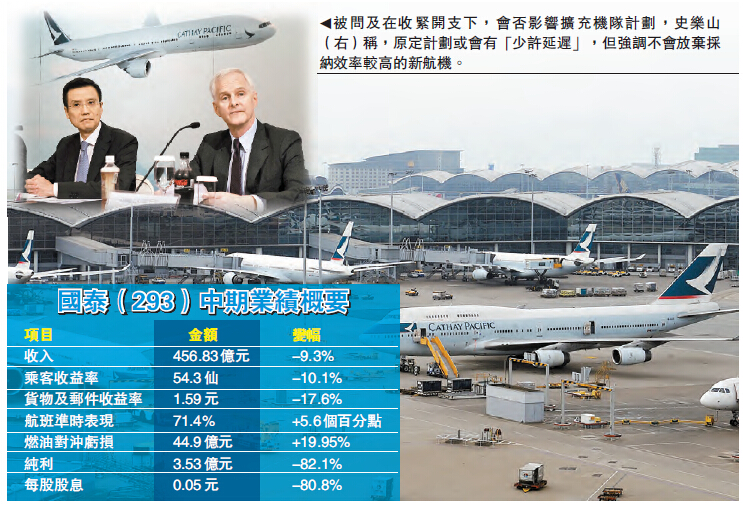 除了致力控制人力成本,國泰在中期業績報告披露,將檢討生產能力及開支,以及限制非必要酌情支出等短期措施。被問及在收緊開支下,會否影響擴充機隊計劃,主席史樂山稱,原定計劃或會有「少許延遲」,但強調不會放棄採納效率較高的新航機。雖然截至今年6月底止,公司營業開支按年減少6.1%,至456.26億元,但飛機維修開支,則按年增長14.2%,至41.7億元。