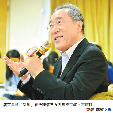 唐英年从法、理、情三方面分析「港独」议题。在法律方面,他指出《基本法》写得很清楚,香港特别行政区是中华人民共和国的一部分,加上自古以来,香港都是中国的一部分,因此「港独」在法律上其实没有空间,也不应该讨论。
