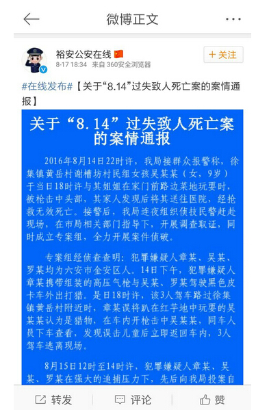 8月17日下午18:34六安市公安局裕安分局官方微博@裕安公安在線發布了官方通報《關于”8.14”過失致人死亡案的案情通報》。