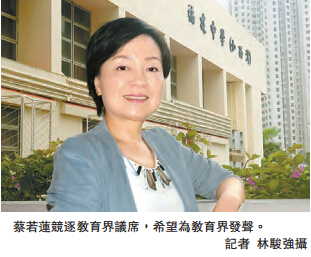 香港教育工作者联会副主席、福建中学(小西湾)校长蔡若莲出选今届立法会选举,竞逐教育界议席,挑战竞逐连任的教协叶建源。她接受本报访问时表示,自己一直在前线服务,感到教育问题愈来愈多,有即将「爆煲」之势:「要有人挺身而出,扭转现时局面。」她认为,立法会选举是4年一次的难得机会,可让教育界别人士再作选择,自己的目标十分明确:「希望拨乱反正,为教育界发声。」评价现任议员叶建源的表现,她坦言对方过去4年作为业界议事代表,没有充分反映业界诉求,反而花很多时间做政治表态。她举例,对方力处理大学校监制度事宜,质疑这是否跟前线教师有切身关系。她提到,早前就有200位校长亲自到立法会请愿,希望当局正视缩班、学生减少的问题,假如叶议员有跟进问题,当可令当局及早正视。