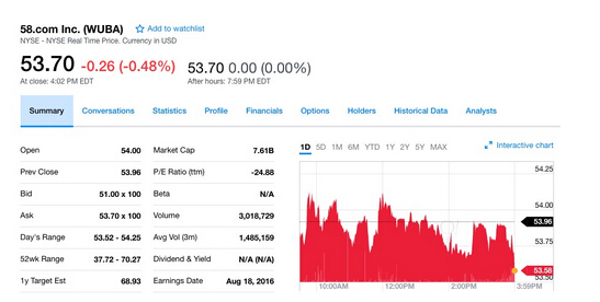 58同城周三在紐交所的開盤價為54.00美元。截至周三收盤,58同城股價下跌0.26美元,報收于53.70美元,跌幅為0.48%。過去52周,58同城股價最高為70.27美元,最低為37.72美元。