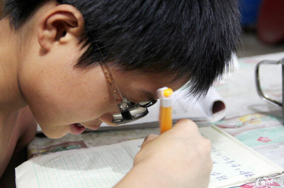 在小浩3岁上幼儿园的时候,老师发现了异常。他们让小浩坐在第一排,他仍看不清黑板。全家人感觉不可思议。匆忙带小浩来到了医院,检查结果惊呆了他们:小浩近视2000多度。爷爷认为医院检查有误,又去了另一家医院,依然如此。一个3岁的孩子,为什么会近视那么多呢?医生说,这和早产有关。出生时,小浩只有7个多月。没有更好的办法,只能先配一副眼镜改善一下视力。眼镜有超薄的,900多元,太贵,买不起。最后选了一副300多元的,比啤酒瓶底还厚,一直戴到了现在。