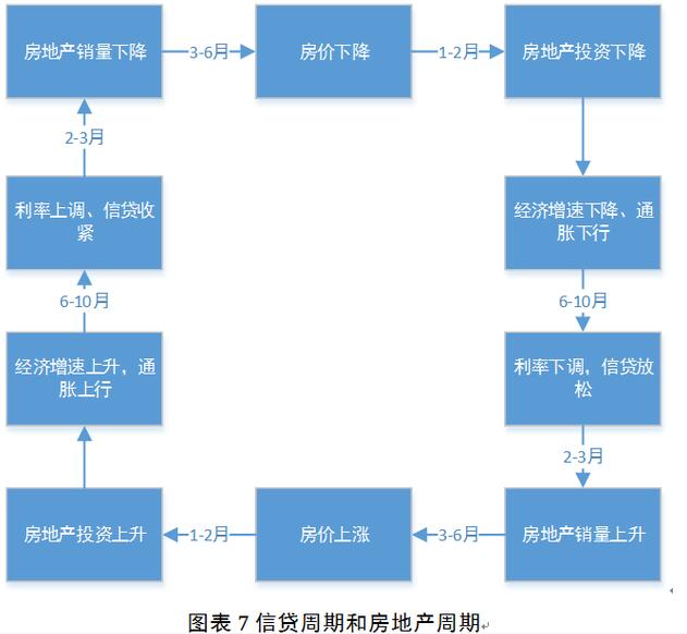 由于房地產投資在GDP增長中起著重要作用,同時房地產價格和租金也會傳到至企業的成本端從而影響整體物價,因此房地產周期與利率信貸周期之間形成了相互反饋的作用(圖7所示)。當貨幣政策放松時,購房需求得到提振,新增貸款和銷售面積上漲,幾個月內房價和房地產投資上漲,直接帶動GDP并傳導至整體物價。