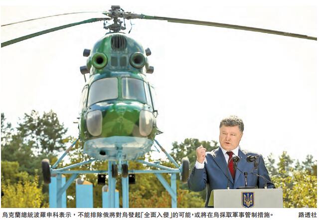 波羅申科18日則說,如果烏東部頓巴斯冲突地區以及該國南部同克里米亞接壤地區的局勢進一步升級,烏不排除實行戰爭狀態的可能性。據報,波羅申科當天是在視察烏西部地區時作出上述表示的。烏國防部早些時候說,在頓巴斯冲突地區,烏政府軍陣地日前遭受來自烏東部民間武裝猛烈炮擊,至少造成3名烏軍士兵陣亡,烏方認為這是去年8月以來烏東部民間武裝對烏政府軍最猛烈的炮擊。