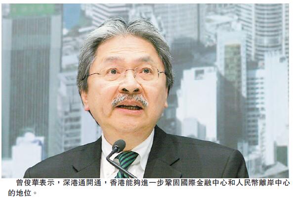 曾俊华在网志表示,深港通4个月後正式「通车」,要答谢中证监、证监会、两地交易所和政府同事过去一段时间的努力,让这个互联互通的新里程碑得以实现。深化两地金融市场的融合,对国家和香港而言都肯定是正确的发展方向,香港能够进一步巩固国际金融中心和人民币离岸中心的地位,国家亦能够借助香港进一步开放资本市场,推动人民币国际化,创造中港双赢,是实现「国家所需,香港所长」的上佳例子。