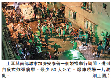 【香港商報網訊】土耳其加濟安泰普省省長阿里昨日證實,當地時間20日晚發生在該省省會加濟安泰普市的一起爆炸襲擊的死亡人數已上升至50人,另有至少94人受傷。土總統埃爾多安昨日表示,此次襲擊很可能是「伊斯蘭國」(IS)所為。