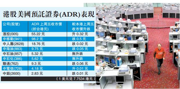 外圍方面,美國聯儲局主席耶倫於本周五舉行的Jackson Hole央行年會上講話,市場對其言論解讀將影響後市去向。港股美國預託證券(ADR)上周五個別發展,控(005)收報55.22元,較本港收市上升0.32元;中移動(941)收報98.2元,下跌0.5元。若按比例計,相當於港股下跌10點,至22927點。