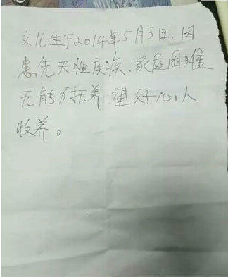 譚建明說,他帶人趕到海韻廣場,在公廁外看到坐在嬰兒車里的小女孩多多。“小女孩一看就很乖巧,不哭不鬧,我們在嬰兒車里沒發現任何衣物或食物,但在車子下面找到一張紙條。”譚建明說,紙條上寫明多多的出生日期及被遺棄原因,但沒注明其家庭和父母信息。記者看到,這張紙條上寫著“女兒生于2014年5月3日,因患先天性疾病,家庭困難無能力撫養,望好心人收養。”譚建明說,從紙條及報警人描述可見,當時將多多遺棄在公廁外的婦女可能就是她的母親。隨后,民警在海韻廣場及附近走訪群眾和調閱監控,并發動派出所全體民警在微信圈轉發多多的情況,但都沒有發現相關信息。