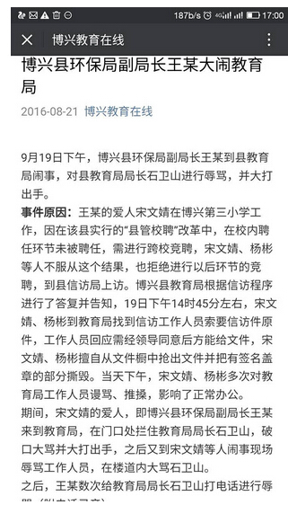 8月21日,山東省濱州市博興縣教育局在其官方微信“博興教育在線”,發布題為《博興縣環保局副局長王某大鬧教育局》的文章,稱8月19日下午,博興縣環保局副局長王某到縣教育局鬧事,對博興縣教育局局長石衛山進行辱罵,并大打出手。