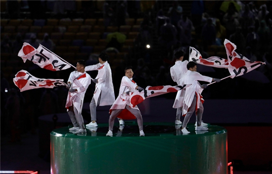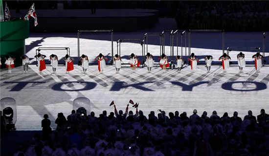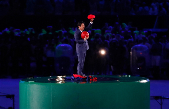 之後是東京奧組委籌備的表演環節。日本首相安倍晉三穿上超級馬利奧裝束首先亮相,之後有大學生運動員體操表演。舞台上同時投射出富士山和東京鐵塔等日本地標。