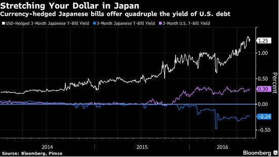據彭博援引PIMCO基金經理Sachin Gupta稱,通過購買負利率的資產,隨后對沖為美元資產即刻創造可觀收益率。短期日本債券幾乎是“無風險”的選擇。