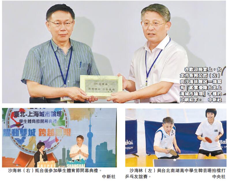 据悉,2016台北上海体育节昨日在台北市立阳明高中正式开幕,沙海林当天下午也顺道参加体育节的开幕活动,还当场组队进行一场乒乓球友谊赛。由沙海林与台湾的南湖高中乒乓球队女学生共组一队,对上和平高中校长陈智源及上海乒乓球女学生代表,最终沙队以11比8击败了陈队。