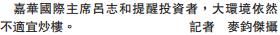 另一方面,內地樓市交投愈趨熾熱,連帶不少地王涌現。呂志和坦言目前內地地價快速上漲,部分價錢甚至「麵粉貴過麵包」,作為香港發展商并非要「100%」做中國地產,集團會尋找合適的投地發展項目,同時「要跟內地發展商學澫,睇嚇人的點做」。此外,他又表示,由於內地優質物業出售后便難以補充土儲,故在銷售物業時,集團傾向保留部分單位用作出租之用。香港、長三角、珠三角覓地對於公司上半年并無錄得新增土地儲備,嘉華國際執行董事呂慧瑜表示,未來將持續物色土地,涉及地點包括香港、長三角及珠三角等地區。集團財務總監林鋈鎏則透露,下半年集團將陸續推出多個項目,包括香港啟德發展區第1I區2號項目,目前已入紙申請預售樓花同意書,料今年下半年推出市場;另大埔市地段第226號項目將於近期內開始動工興建。