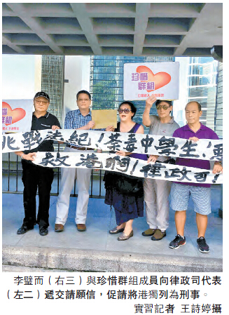 【香港商報網訊】實習記者王詩婷報道:針對近期有團體有意在中學開學宣揚「港獨」。珍惜群組發言人李璧而認為,決不能讓「港獨」思潮走進校園,昨日在金鐘高等法院向律政司代表遞交請願信件,促請盡快將「港獨」列為刑事罪行。
