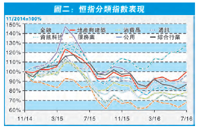 深港通是否有得炒,筆者不肯定。不過,長線買港股,在P/E較低的情況下,不妨考慮於低位逐步買貨。長線持有港股,除了看表現及便宜與否外,也宜看其息率回報。在不同板塊的股息上,圖中見到現時高於整體恒指的有金融、地產與建築、通訊、能源及綜合企業。如果大家長線持有港股收息,這些板塊確可考慮。但如果再考慮近年表現的話,圖三見到由2009年3月金融海嘯後至今,地產與建築及綜合企業的表現都稍優於恒指,升近六至七成,再加上圖一顯示這兩個板塊的抵買程度,似乎要揀既平而表現不差的板塊就非這兩個莫屬。