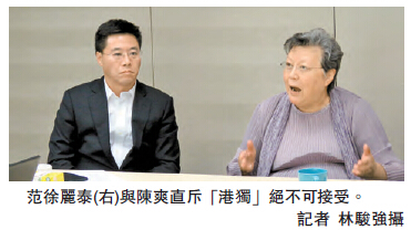 勵進教育中心理事會主席范徐麗泰、理事陳爽昨日與傳媒聚會。身為全國人大常委的范徐麗泰明言絕對不能接受「港獨」,坦言這只會令香港前途盡喪。她強調,中央在經濟等方面全力支持香港,而本港許多能源、食物都來自內地,在各方面跟內地都是唇齒相依。范徐麗泰反對於學校成立鼓吹「港獨」的組織。她稱,要完全禁止在學校討論並不可行,最重要是「擺事實,講道理」,讓教師將正、反兩面的理據都提及,並指引學生。她提醒說,無論從歷史上、文化上,香港都是中國不可分割的一部分,香港亦沒有自己的文字,更沒有所謂「香港民族」,尋根問源終究是來自中國文化。