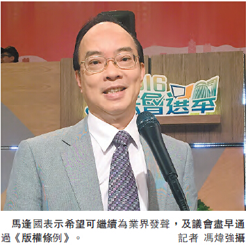 【香港商報網訊】記者馮煒強報道:《2014年版權(修訂)條例草案》沒有在上屆立法會得到通過,立法會功能組別體育、演藝、文化及出版界候選人馬逢國及周博賢昨日出席香港電臺選舉論壇時亦有討論此問題,馬逢國表示,希望議會盡早通過有關條例,令版權持有人得到保障。