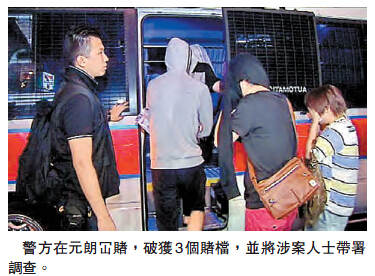 另外,至昨午5時許,警方在香港仔漁歌街5號搗破一個無牌賭檔,當場拘捕8男1女,檢獲一批賭具,包括麻將枱、籌碼及現金。差不多同一時間,警方又在上水巡撫街20號破獲另一個無牌賭檔,拘捕2男6女,檢獲電動麻將枱。