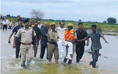 印度中央邦首席部長喬漢視察洪水災區時,由兩名警察抬著