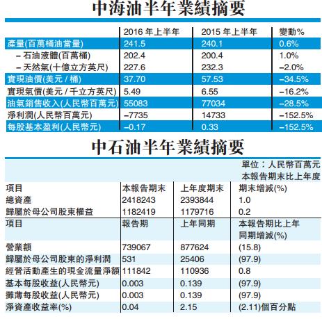 受國際油價低迷的影響,兩大中國油企業績見紅,中石油(857)上半年純利5.31億元(人民幣,下同),按年下跌97.91%,每股盈利0.3分,中期股息每股0.02131元。中海油(883)上半年由盈轉虧,蝕77.38億元,雖然每股虧損0.17元,但仍派中期息每股0.12港元。