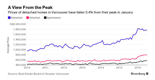 成交量下降的同時,房價漲速也在放緩。7月獨立住房均價較今年1月下跌3.4%至176萬加元(約合140萬美元)。以下彭博圖表展示大溫哥華區各類住房2010年以來平均房價走勢。