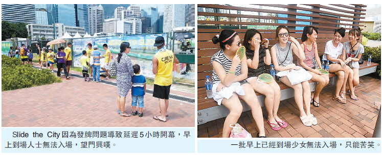 「Slide the City」原定早上9時開幕,但大批玩家到場後「摸門釘」。主辦單位約於9時許公布,因未獲發臨時公眾場所娛樂牌照,早上場次須取消,其後再宣布12時至下午3時時段繼續暫停。負責發牌的食環署表示,主辦方已呈交所需承諾書,並確定有關臨時構築物符合結構安全標準,故已就該活動發出臨時公眾娛樂場所牌照,「Slide the City」最終於下午2時開幕。