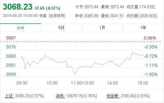 截至收盤,滬指跌0.57%報3068.33點,成交2009億元;深成指跌0.76%報10679.2點,成交3058億元。