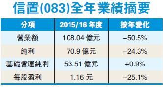 信置主席黃志祥於業績公告指,受經濟環境及房地產相關政策的影響,香港物業市場繼續整固,2015/2016財政年度的物業銷售量和價值按年下降。而香港政府在規劃或改劃用地、推出新發展區和擴展新市鎮的努力,能為住宅及商用物業發展的長遠供應提供解決方案。