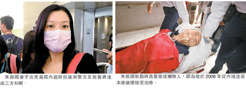 【香港商報網訊】11年前因行「單咇」執勤時擒賊被割傷頸項而成植物人的警員朱振國,其妻於2008年入稟高院指責警務處處長疏忽,分派朱振國於危險崗位,致他傷重命危,向處長及以果刀傷人的賊人廖智勇追討人身傷亡賠償,雙方終在昨日達成和解,警方將會就案件作出賠償,但拒絕透露涉及金額。而刀手廖智勇雖然承認責任,但由於他已告破產,原告及律政司亦終止向他追討。