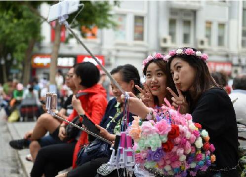 2016年6月8日,在哈爾濱市百年老街中央大街上,兩位參與“狂歡”的女孩在自拍。 新華社發