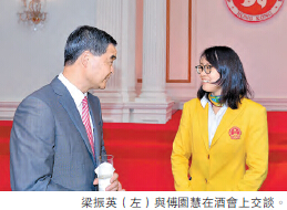 梁振英在歡迎酒會上致辭時說,這場歡迎酒會體現了香港社會各界對內地奧運精英代表團訪港的歡迎和重視,更說明了我們對代表團來訪的感謝。里約奧運會期間,香港市民和國家運動員血相通、脈相連,為大家鼓勁,為大家歡呼。本屆里約奧運會國家運動員在多個項目表現突出,取得優异成績。