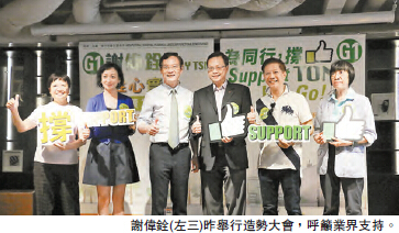 立法會選舉迫近,競逐連任建築、測量、都市規劃及園境界的謝偉銓,昨日舉行造勢大會鞏固票源。他獲自動當選立法會商界(第二)的廖長江和前教統局首席助理秘書長、兼老師馬紹良等猛人撐場,而且地產界人士亦到場支持。謝偉銓表示,雖然選情激烈,仍對自己感到樂觀,但不能掉以輕心。他又擔心,自己一旦在選舉失敗,未來4年該界別將會大件事,呼吁選民投他一票。他又批評有候選人「離地」和半桶水,「無端端整個驗樓師,我抅没呢個專業濐」,又不熟悉。