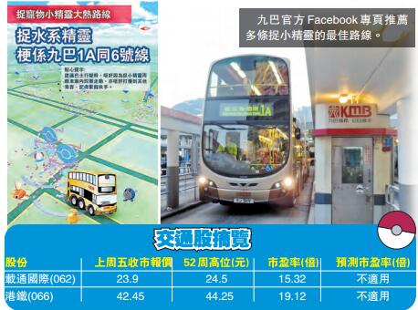 自Pokemon Go遊戲在香港推出以來,成功擄獲男女老少的心,令人人都化身成精靈訓練員周圍去捕捉小精靈。由於不同的小精靈窩藏於全港各區,令一眾精靈訓練員日夜穿梭各區,尋找心儀的精靈。要走遍各區,自然要搭車,這正利好本地的交通股;其中,九巴母公司載通(062)及港鐵(066)值得留意。 香港商報記者 譚之穎