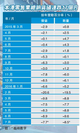 政府統計處指出,今年首七個月,零售總銷貨值下跌10.1%,總銷貨數量下跌9.9%。按年比較,珠寶首飾、鐘表和名貴禮物銷貨價值跌26.2%,百貨公司貨品跌6.9%,電器及攝影器材跌21.8%,汽車及汽車零件跌8.5%,雜項耐用消費品跌34.4%,燃料跌2%,鞋類、有關制品及其他衣物配件跌1.1%,中藥跌1.5%,眼鏡店跌0.4%。