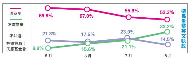 【香港商報訊】蔡英文上台主政已滿百日,台灣民意基金會昨日公布最新民調指出,蔡英文的民意支持度已由5.20剛上任時的69.9%,迅速下降到52.3%,下降17.6百分點。有33%的人對新小英的表現不以為然,大幅增加24.4個百分點,其中兩岸不滿度增逾倍。台灣民意基金會董事長游盈隆指出,蔡英文聲望急速下滑且沒有明顯停止跡象,蔡英文的「蜜月期」將結束。東華大學民族發展與社會工作學系教授施正鋒直言,蔡政府執政后許多政見都「昨是今非」,稱蔡英文是「昏君」。