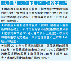 ★按照2016年4月底数据测算:深股通标的股票812只,市值占深市总市值之比约70%;深港通下的港股通标的股票(由目前的318只)增至430只,市值占香港总市值之比约86%。