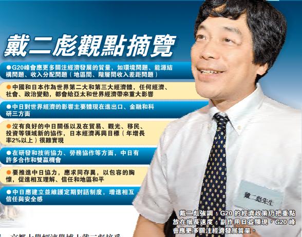 中國杭州即將舉行二十國集團(G20)領導人峰會之際,日本亞洲成長研究所研究部長、主席研究員、京都大學經濟學博士戴二彪接受香港商報專訪時表示,目前各國的經濟政策大多仍然把重點放在增長速度,以及如何操作金融政策和財政政策刺激經濟增長。惟這些政策的副作用已日益顯現,因此,G20峰會應更多關注經濟發展的質量,包括環境問題、能源結構問題以及收入分配問題(地區間、階層間收入差距問題)。G20回應本國正在改變中的社會需求,便能夠促進技術創新、制度創新以及新產業的成長與發展。香港商報記者 莊海源