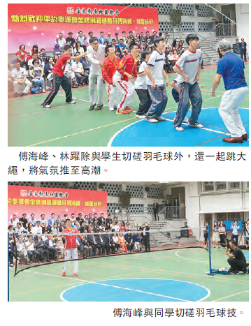 【香港商報網訊】記者謝巧玲報道:里約奧運會內地奧運精英代表團旋風式訪港,三天行程畫上完美句號。期間同屬潮籍的奧運羽毛球男雙金牌傅海峰、十米高臺男子雙人跳水金牌林躍日前出席香港潮屬社團總會安排的活動,到訪潮商學校與潮籍鄉親、學生交流,切磋球技,還跳大繩。兩位金牌運動員與300位學生打成一片,并勉勵同學要有不屈不撓的精神,長期奮斗的心,好好裝備自己,面對挑戰,為國爭光。