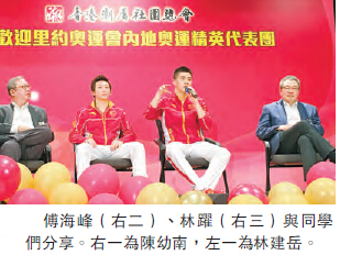 在交流環節中,兩位金牌運動精英逐一解答與會者問題。傅海峰指比賽時并沒有太大壓力,反而越多人看越興奮,會將最好的水平發揮出來。他更勉勵同學不要急求成功,只要一步一步往上走,一定會成功。今次是他最后一屆參與奧運,但表示自己這輩子都離不開體育,「如果香港需要我,可以來效力。」