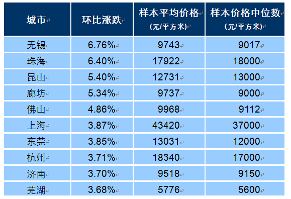 中指院數據顯示,8月份全國100個城市(新建)住宅平均價格為12270元/平方米,環比上漲2.17%,漲幅較上月擴大0.54個百分點;同比上漲13.75%,漲幅較上月擴大1.36個百分點。環比漲幅排名前四的城市分別是無錫、珠海、昆山、廊坊,漲幅均超5%。 Z