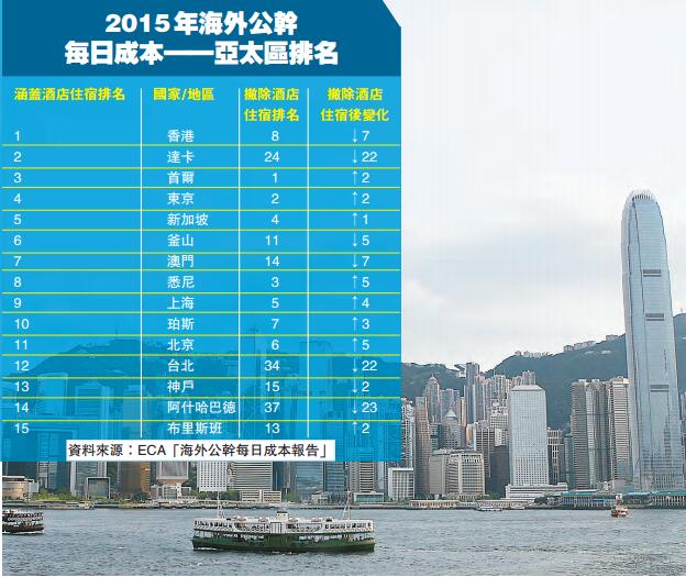 【香港商報网訊】記者曾浩榮報道:人力資源管理顧問公司ECA International最新「海外公幹每日成本報告」顯示,2015年派員在港出差每日成本高達約496美元,貴絕亞太區;當中酒店住宿佔比最大。ECA亞洲區域總監關禮廉表示,本港地價高企,加上商務酒店供應稀少,推高酒店房價;按4星酒店計,相比韓國首爾、新加坡及日本東京等地,香港的酒店房租貴約20%。