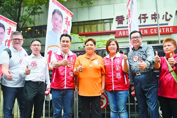 「肥媽」(中)及李鋈麟(右二)在香港仔街頭為郭偉強團隊站台拉票。記者 蔡啟文攝