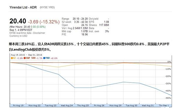 截至本周四的十個交易日內,宜人貸ADR累跌45%,同期標普500跌約0.8%,美國最大P2P平臺LendingClub股價跌約5%。