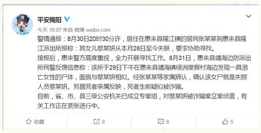 接報后,惠來警方高度重視,全力開展尋找工作。8月31日,惠來縣靖海邊防派出所民警反饋信息稱:該所于29日下午在惠來縣靖海鎮綠洲度假村海邊發現一具溺亡女性的尸體,面貌與蔡某妍相似。經張某某等家屬辨認,確認該女尸就是失蹤人員蔡某妍。另據死者親屬反映,死者生前疑似被詐騙。