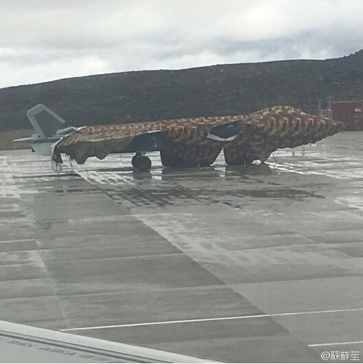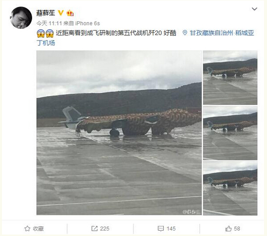 網友微博@蘇蘚苼 在四川甘孜藏族自治州的稻城亞丁機場發微博稱: 近距離看到成飛研制的第五代戰機殲20,好酷。