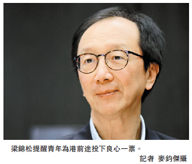 梁錦松表示,「一國兩制」已在港實施19年,是「50年不變」中的三分之一,是次立法會選舉結果有可能影響明年的行政長官選舉,故是決定性的一「投」。他理解由於香港發展定位不清晰,青年人面對「難上位」及「難上樓」等困難,「港獨」成為近日熱話,青年人有可能抱著即管試一下激進路線的心態,但香港從歷史、法理上都是中國的一部分,沒有獨立的理由及條件,「港獨」不單不是香港的出路,更可謂是「自殺」,是香港部分人失去信心、希望與關懷的副產品。