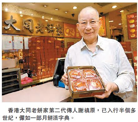 香港大同老饼家第二代传人谢禛原,已入行半个多世纪,俨如一部月饼活字典。他告诉记者,月饼的制作历史印证了香港社会的经济发展,大同老饼家成立於1943年:「那时香港还是日占时期,物资缺乏,没有做月饼的原材料,仅有蔗糖、花生,连面粉都很少。」