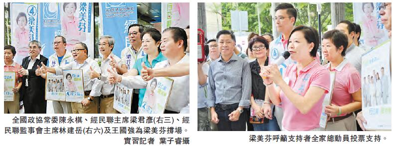 为梁美芬撑场的梁君彦指出,市民要选择香港发展、及改善民生,抑或是继续沉沦,由市民的一票去选择,又强调梁美芬多年在九龙西拼搏,为当区居民向政府争取了很多优惠和建设,希望市民用选票支持梁美芬。