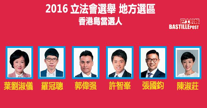 香港岛选区,新民党的叶刘淑仪以60760票成为我票最多的候选人,成功连任。得票跟随其後的是香港众志的罗冠聪,23岁的他第一次参选就以50818票高票当选,连他自己都觉得意外。罗冠聪也成为历来最年轻的立法会议员。其余当选的还有工联会的郭伟强、民主党的许智峯、民建联的张国钧,最後一席由公民党的陈淑庄和无党派的王维基争持,最终陈淑庄以35404力压得33323票的王维基胜出。